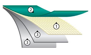 Composition: high-strength PES fabric (1) with outer synthetic rubber coating (2) and inner natural rubber blend coating (3). The material is highly resistant to abrasion, ageing and UV. Tensile strength min. 3000/3000 N (sample 20x5 cm). Minimun weight 913 g/m