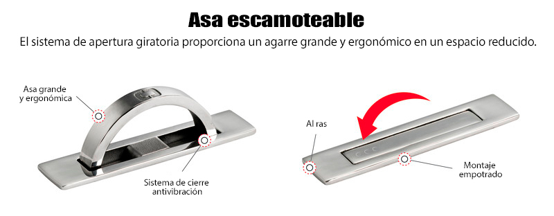 Pequeña manija de acero inoxidable. El sistema de apertura giratorio ofrece un agarre amplio y ergonómico en un espacio reducido. ​• Para montaje empotrado. • Equipada con sistema de cierre antivibración. • Radio de borde: 8 mm   Leer más »