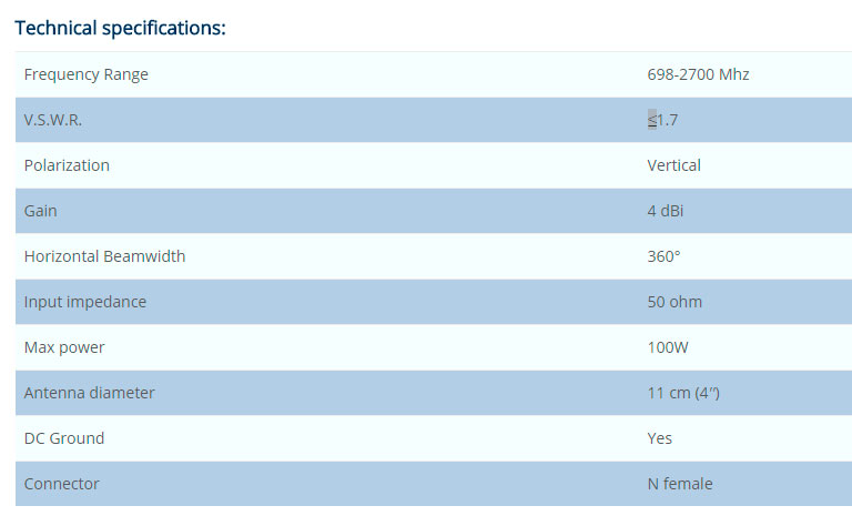● Omni-directional antenna 4 dBi wideband 3G/4G/LTE antenna d. 11 cm (4″)