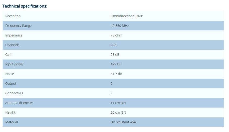 ● Omnidirectional design eliminates the time needed to locate the direction of the TV and radio transmitter, and the built-in high gain amplifier (25 dB) with low noise figure guarantees an excellent picture quality, both on horizontal and in vertical polarization. The splitter/power inserter included with the antenna allows to connect two devices at the same time, TV or radio FM.