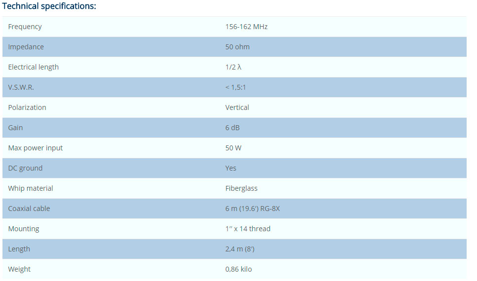 ●  The antenna is supplied with 6m (20′) high performance RG-8X cable with 97% copper braid coverage, that guarantees a perfect shielding from external interferences. Stainless steel ferrule with standard 1″ x 14 threads to fit on every type of mount (stainless steel/chrome brass mounts are suggested).