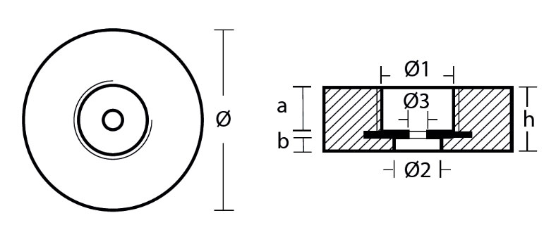 Ánodo de ZINC para la popa, de 135mm, con inserto de acero. Se usa en la popa de Yates y Superyates Peso: 3.91Kg      Referencia    Peso Ø a b h Ø1 Ø2 Ø3 00152 3.91 kg 135 mm 35 mm 9 mm 47 mm 50 x 3 mm 32 mm 14.50 mm Leer más »