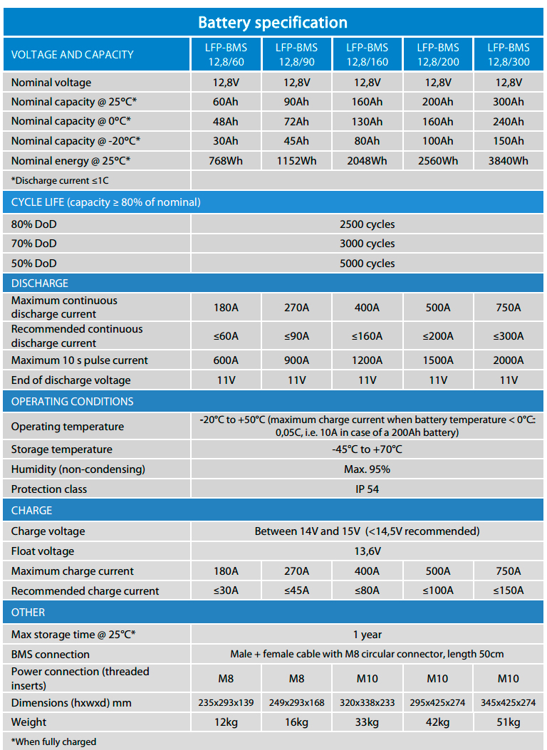 ● Lithium-iron-phosphate (LiFePO4 or LFP) is the safest of the mainstream li-ion battery types. The nominal voltage of a LFP cell is 3,2V (lead-acid: 2V/cell). A 12,8V LFP battery therefore consists of 4 cells connected in seri...read+